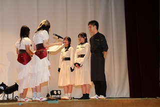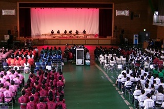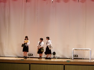 「執心鐘入」の一場面![]() 最後は、生徒会の二人が感謝の花束を贈呈 ![]() | 第二部では、古典音楽「かぎやで風節」と組踊「執心鐘入」が演じられ、中・高あわせて約1080人が舞台に見入lりました。音楽や踊りもさることながら、沖縄の衣装が鮮やかで、印象に残っています。 |