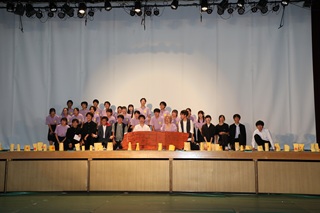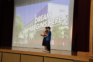 21日3限の時間帯より、本年度の新入生歓迎会を体育館にて行いました。 吹奏楽部演奏「ラデツキー行進曲」に合わせ生徒会役員に誘導されながらの中高新入生入場で本年度も「新歓」がスタート。 初エントリーの生徒会執行部コーナーでは「モチベイダー」も随所でムードを盛り上げつつ執行部の面々が生徒会の活動をわかりやすく説明してくれました。吹奏楽部がディープパープルメドレーで一気に会のテンションを高めてくれ午前の部は終了。 午後の部では、演劇部が「キサラギ」でアイドル歌手の死を巡る群像劇を丁寧に演じると、応援団は「型」「チア」とも息のあったあでやかなステージを披露してくれました。続く箏曲部の発表では、おだやかな箏の音がやがてドライブ感あふれるダイナミックな演奏に変わり盛り上がりを見せました。 | 第3部の旧桐蔭中3生の2本の発表には、その圧倒的なプレゼン力と企画力、編集力に驚きを隠せなかった新入生も多いはずです。放送局の発表はシリアスなラジオドラマとギャグを詰め込んだビデオ映画予告の軟硬おりまぜたカップリング。最後は真っ赤な新クラブTシャツでお目見えの音楽部が、きらびやかな中にも美しいハーモニーの数々で「トリ」を飾ってくれました。 生徒会企画としてステージのつなぎに先生紹介ビンゴも組み込まれるなどしっかりと企画・準備された充実したプログラムでした。 驚きや感心とともに先輩達の桐蔭らしい充実したパフォーマンスに触れた新入生たちには、改めて桐蔭のすばらしさを目一杯体感できるす素敵な一日となったに違いありません。 |