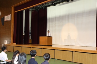 ◆7月18日(金)壮行式に続いて1学期終業式を行いました。県民歌・校歌斉唱の後、校長先生から、「学んだことを行動や実践につなげてほしい」「今何をすべきか、主体的に考えて行動してほしい」「興味があることに積極的に参加し、自分を高め、視野を広げることに挑戦してほしい」など、1学期の振り返りや夏休みをどう過ごすかについてお話がありました。夏休み中、それぞれが充実した日々を過ごし、2学期始業式に成長した姿を見せてくれることを期待しています。