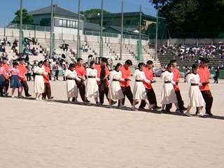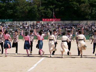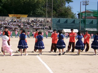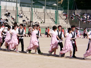 午前の部では、クラス対抗リレー予選、200m走、100m走、台風の目、短綱引き、長縄など多彩な競技が行われ、最後には3年生によるフォークダンスが披露されました。文化祭の模擬店衣装を身にまとった生徒たちのダンスは、華やかで笑顔にあふれ、観客の心を和ませました。昼休憩中には、記念撮影を楽しむ姿も見られました。