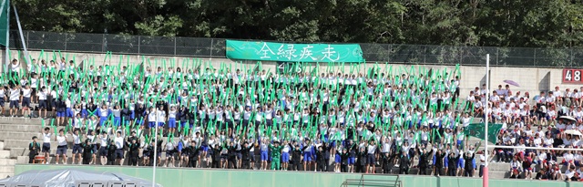 閉会式で表彰を受ける赤ブロック団長2年加藤君。 | 台風一過の秋空に重く停滞した秋雨前線。大会予備日となった23日の開催も当初は危ぶまれましたが、大会進行とともに天候も穏やかに回復、スケジュール通り全17のプログラムを無事に実施することができました。 午前の部では、短・中距離走の個人種目に続いて、最初の団体戦・高1、高2女子による「棒引き」が行われました。4mの竹棒5本を両サイドから奪い合いいち早く陣地に引っ張り込むというこのスリリングな競技、「粘り」と「あきらめ」を切り替えつつ、楽しくも激しい女子の戦いぶりが印象的でした。 午前の部のラストは、今や桐蔭体育大会のスタンダード、3年生にとっては年間最重要イベントの一つとなった「フォークダンス」。この日の晴れ舞台のために思い思いのセンスとアイデアを丁寧に凝縮させてきたカラフルでコミカルなコスチュームに身を包み、新旧3曲を煌びやかにそして思い出を全身に刻み込むかのように踊りきりました。 午後の部は、これもまた恒例の「ブロック応援合戦」でスタート。応援リーダー率いる「黄」「緑」「赤」3つのブロック各360人が4分間のオリジナル応援パフォーマンスを披露し競い合いました。どのブロックも団結力、デリバリーとも甲乙付けがたいパフォーマンスでしたが、桐蔭タオル旋回を効果的に取り入れ、力強く「声」を響かせた赤ブロックが僅差で応援の部1位に輝きました。 「攻守」がドラスティックに激突し合う、「騎馬戦」、「棒倒し」では、男子のワイルドな一面がフィールド全面に展開。思わず息をのむエキサイティングな瞬間もありましたが、大きなトラブルもなく、スペクタクルな中にも桐蔭的なバランス感覚が随所にあふれる団体戦となっていました。 まるで種目のコツとストラテジーを体得しているかのようにかなりのチームが滑るように「走って」いた「女子ファイブレッグレース」。緑ブロックが学年3レース中2レースを制しました。 全学年がブロックの枠を越えフルエントリーでぶつかりあった「クラス対抗リレー決勝」では、クラブ現役生の俊足ランナーをそろえた2年生が力強く1位、2位を独占、「さすが」の結果となりました。 最終種目は大会ハイライトの「ブロック対抗リレー」。各ブロックより選ばれし24名の韋駄天達がブロック代表の名にかけてフルスロットルでトラック9周を激走。結果、赤ブロックが大一番のデッドヒートを制しました。(なお、このレースには若手教員チームもエントリー。16人が超変則的にバトンをつなぐと、アンカー岸田校長先生が万雷の拍手に迎えられながらダントツの最下位でゴール。体育大会に「画竜点睛」とも言える花を添えました) 競技の部は、午前中の勢いもそのままに赤ブロックが最後まで独走し2位の緑ブロックを突き放し優勝、応援の部と合わせ見事にW優勝を勝ち取りました。 本年度の桐蔭祭の締めくくりとしての体育大会。個人の力とチームの団結力、そして何より声援と拍手と笑顔が作る「感動の瞬間」がぎっしり詰まった素敵な秋の一日となりました。 |