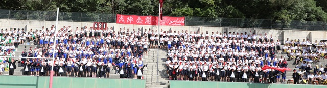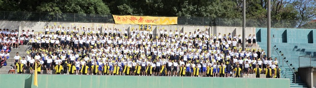 スタンドに収まった全校生徒1080人。壮観です。 | 台風上陸に伴う臨時休校のため、20日(火)実施予定の体育大会予行・準備が翌21日(水)に改めて行われました。(21日(水)実施予定の大会本番は23日(金)に順延されます) 午前中は各種目の入退場や演技の位置取り等の確認を中心に、午後は各応援ブロックごとの全体応援練習と、グラウンド周りの準備を係別で行いました。 黄・緑・赤3ブロックに分かれての応援は、中1から高3までの学年縦割りの高校7クラス+中学校AB混合クラス。高1、2年の応援リーダーたちは時間に追われながらも、スタンドの座席位置の指示や応援アンセムの練習等、懸命に300人あまりのブロックをリード。本番の応援合戦でのパフォーマンスの完成度を高めるために奮闘していました。 文化祭から連なる桐蔭祭締めくくりの体育大会。仕切り直して安全に健全に完全に燃焼して、感動の瞬間を思い切りきらめかせましょう。 ●力作です!スタンド最上段に登場した各ブロック応援パネル