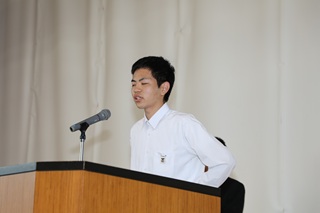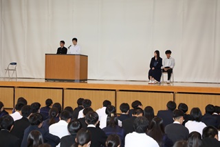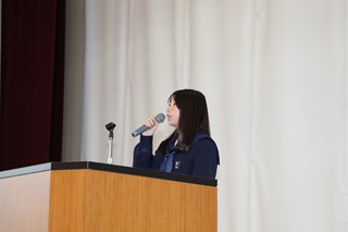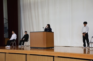 続いて、生徒会長1名、副会長1名の立候補者が登壇し、それぞれの公約や意気込みを力強く語りました。また、応援演説者からは、立候補者がいかに会長・副会長にふさわしい人物であるかを熱く語る場面もあり、会場は大いに盛り上がりました。